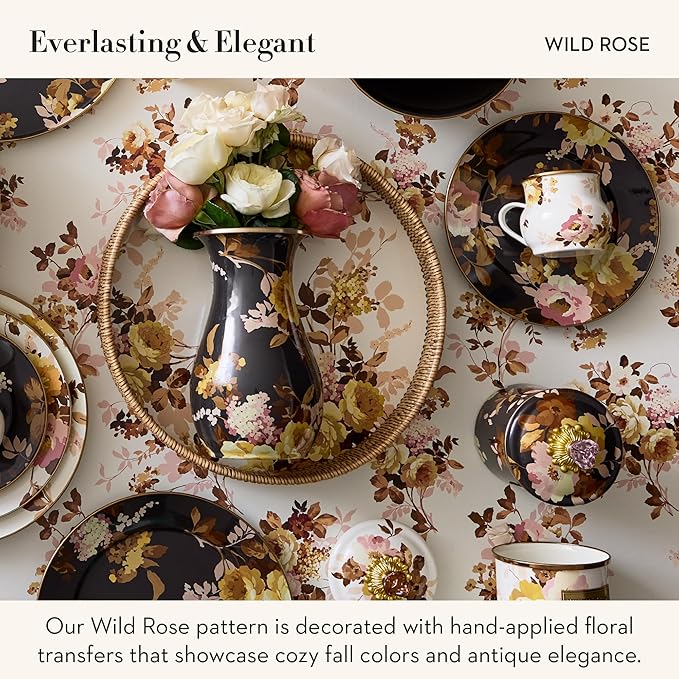 - ELEGANT ACCENT: Farmhouse fresh and inspired by traditional glass milk jugs, the Wild Rose Brown decorative vase features a hand-glazed steel underbody, a bronzed rim, hand-applied floral prints, and warm fall colors set against a dark backdrop.