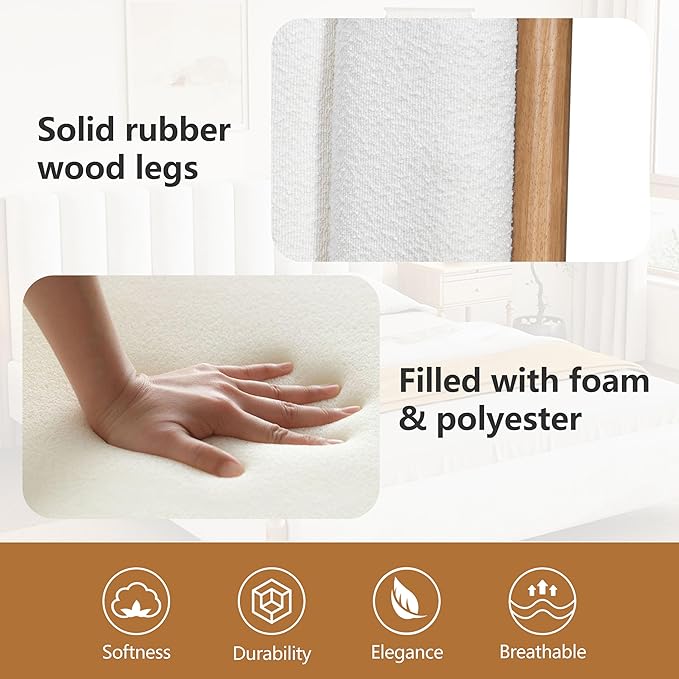 - Modern Minimalist Aesthetic:With its clean vertical lines and sleek rubber wood legs, this upholstered bed frame blends seamlessly into contemporary, Scandinavian, or boho-chic bedrooms. The neutral white finish and fluffy boucle texture elevate any decor