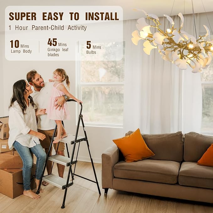 - User-Friendly Chandelier Installation: Measuring 13.7 x 13.7 x 36 inches,our modern chandelier features an adjustable cable that extends from 0 to 92 inches, making installation easy.Crafted from aluminum alloy, each detachable branch is simple to assemble. Just hang the ceramic ginkgo leaves onto the branches.The ceiling canopy works with both flat and sloped ceilings for effortless setup.Take your time during installation,and you’ll soon have a stunning piece of modern art to enjoy.