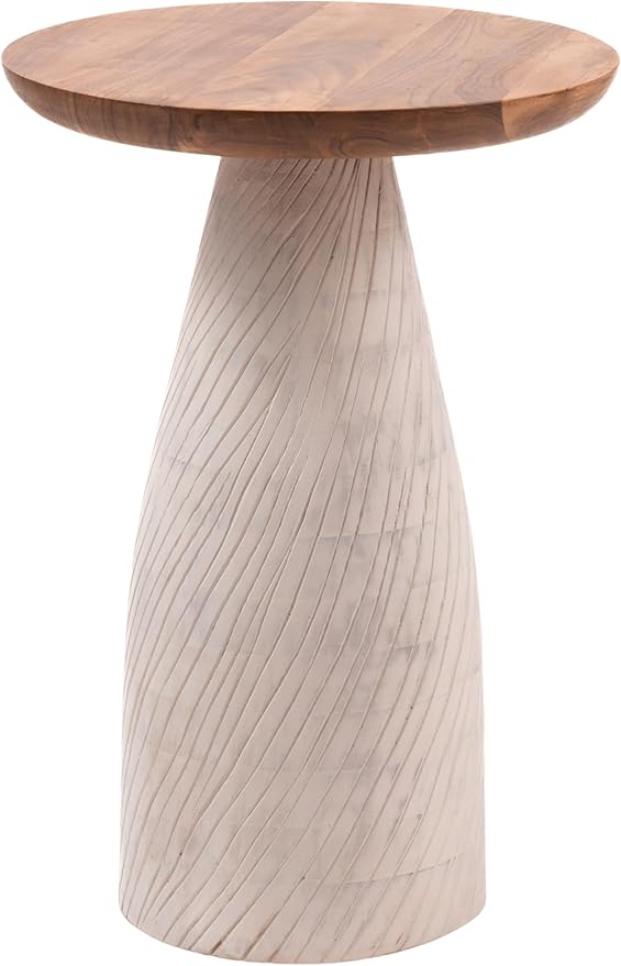 Modern Round Wood Accent Table with Carved Cone Base Solid Mango Wood Side Table for Living Room, Bedroom or Entryway White,Assembled