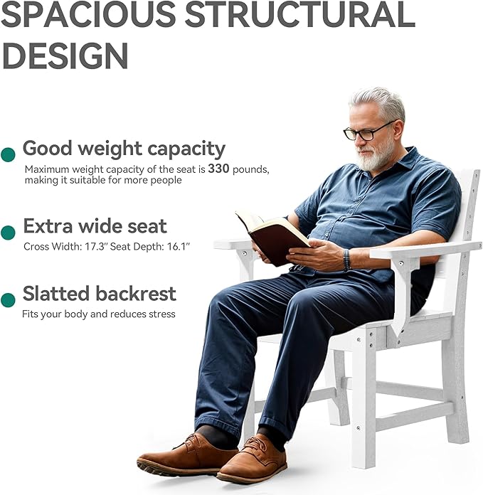 - Sturdy & Comfort-Oriented: The outdoor furniture set includes sturdy backrests and wide armrests; The table supports up to 165 lbs, and each chair up to 352 lbs; Spacious design with 16.15"D x 17.32"W seat accommodates larger individuals comfortably