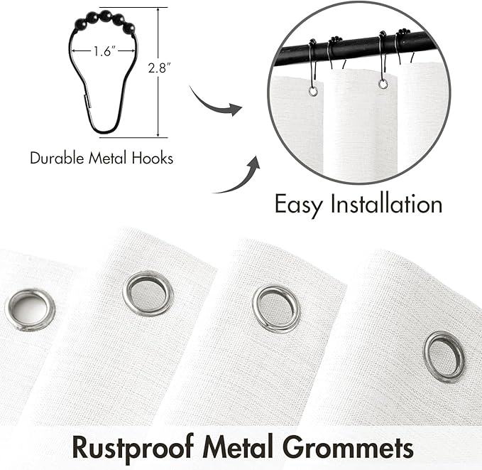 - Package Includes: Comes with 1 faux linen shower curtain featuring reinforced metal holes and 12 bonus metal hooks,rust resistant and easy to slide.You will enjoy the added convenience of these bonus hooks while saving on the cost and effort.
