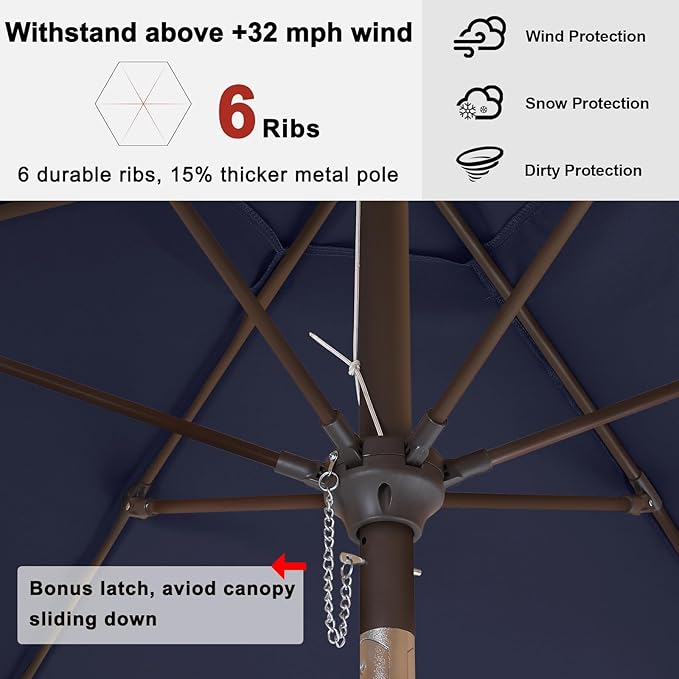 - Fiberglass Ribs: Heavy duty fiberglass ribs form a spacious top to provide strong stability. They are tougher, more elastic than iron ribs, so our outdoor umbrellas stand straight under strong wind and rain.