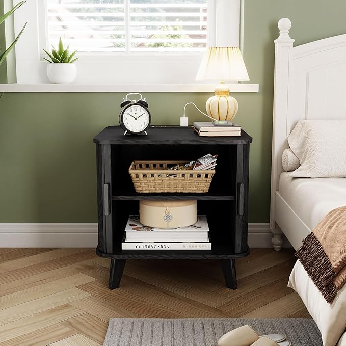 - UNIQUE DESIGN --- This round side table features a unique fluted curved sliding door design and spherical legs, the Angle-free curved look neutralizes the impact of the space, softens the style of the bedroom or living room and blends well into different styles of furniture. This versatile wood side table is available in three colors, so whether you want rustic, modern or vintage style, it will work for your.
