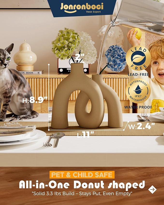 Hug Donut Decorative Vase Set - Tan Modern Rustic Farmhouse Style Vases Home Decor,Matte Ceramic Decorations for Living Room Shelf, Bookshelf Mantle Entryway Table Centerpiece or Console Décor(Brown)