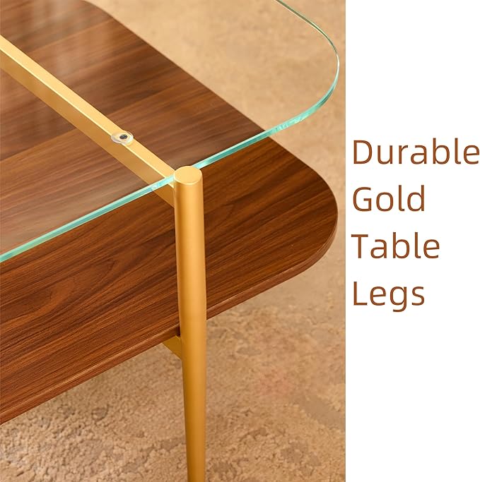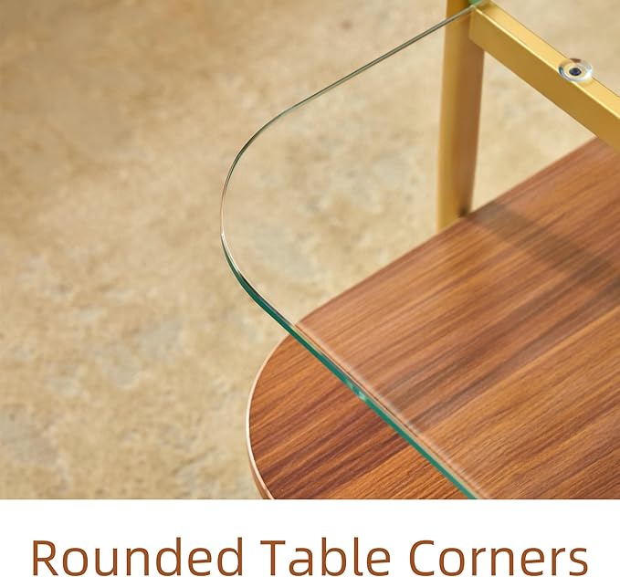 - Double Layer: The coffee table is crafted with a transparent rounded corner glass top and a lower rounded cornor walnut MDF board for added functionality. The two layers offer ample storage space while adding a touch of sophistication to your decor. The rich, warm hues of the walnut complement the transparency of the glass to create a stunning blend of colors and textures.
