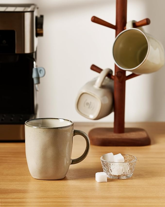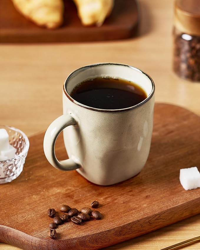famiware Coffee Mugs Set of 6, Ocean Square 13oz Coffee Cup Set with Handle for Cocoa, Milk, Hot Chocolate, Tea, Water, Stoneware Cups for Kitchen, Microwave and Dishwasher Safe, Light khaki