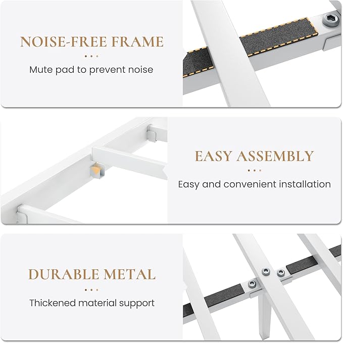 - STURDY AND SILENT: Crafted from thick metal tubes, our bed frame has a weight capacity of up to 800 lbs. Each metal bar features a silent pad, ensuring a noise-free night's sleep. Experience ultimate comfort and support with our bed frame