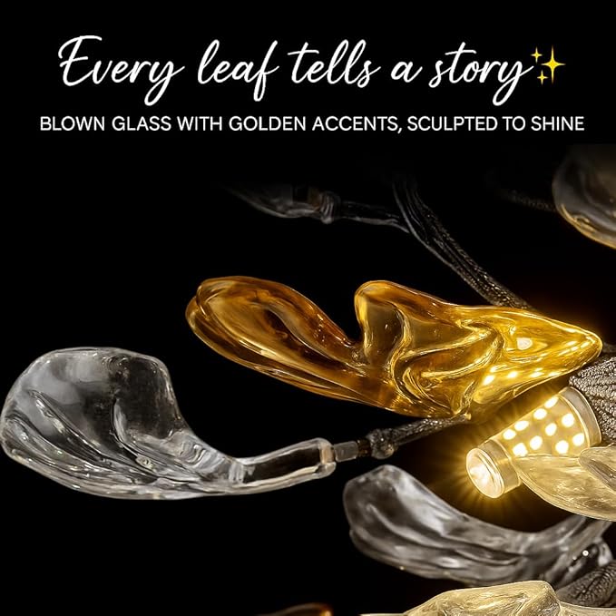 - Modern Tree Branch Chandelier: Inspired by nature, this unique chandelier chandelier features hand-blown glass ginkgo leaves in amber and clear tones. Each leaf is individually crafted by artisans, adding texture, movement, and uniqueness to the design. Perfect above dining tables, it creates a warm, elegant glow that transforms your dining room into an inviting, artistic space.