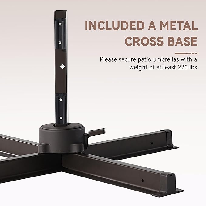 - Cantilever Umbrella: The patio umbrella has a metal cross base, you can secure in other ways to ensure the stability of the outdoor umbrella; If you need to use the base to enhance the stability of the umbrella, a over 220 lbs umbrella base is recommended