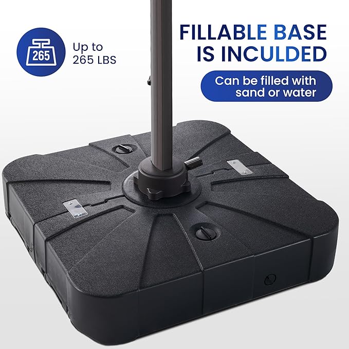 - Patio Umbrella with Base Included: The outdoor cantilever umbrella includes a fillable umbrella base, The base needs to be filled with 90% sand and 10% water, weighs up to 220 lbs after fully filled; The base will be delivered separately, so you won't receive both the umbrella and the base at the same time