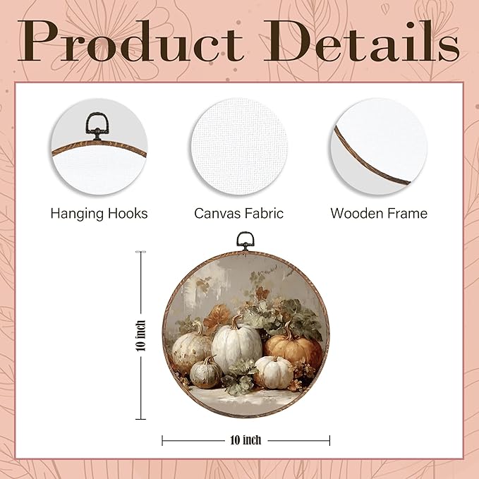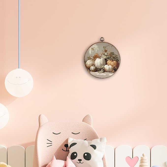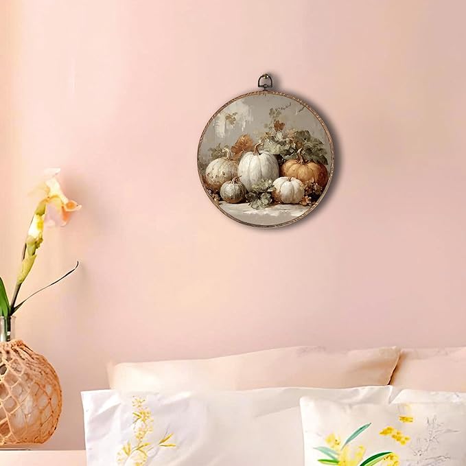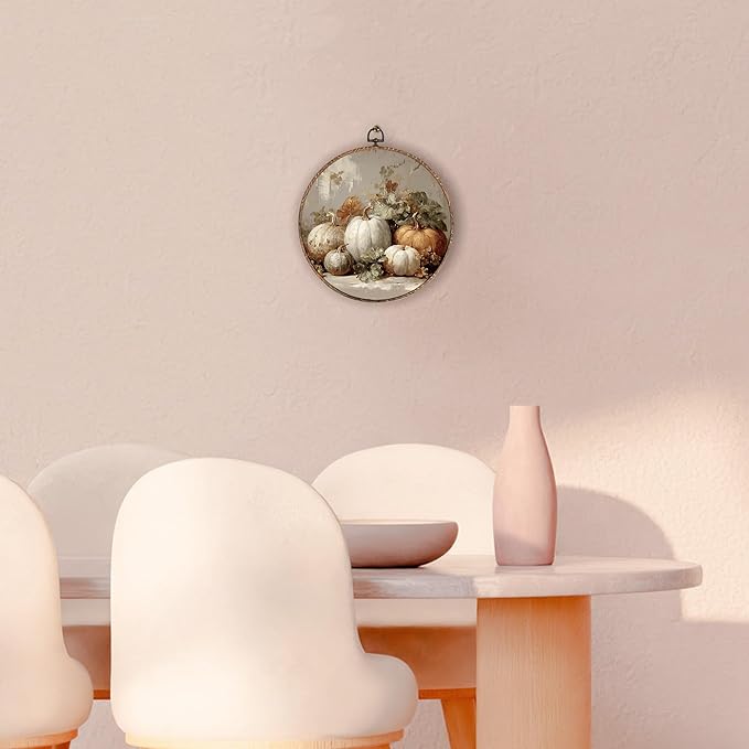 Hxlac Vintage Fall Pumpkin Maple Leaves Round Wall Art Framed, Fall Halloween Pumpkin Round Wall Decor, Vintage Autumn Hanging Canvas Prints Wall Sculptures for Farmhouse Home Decor, 10x10 Inch