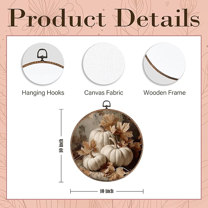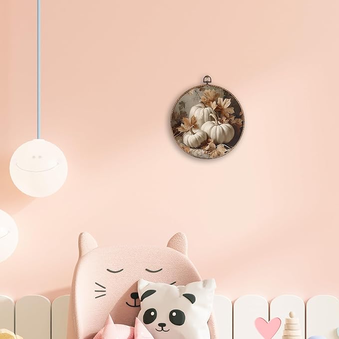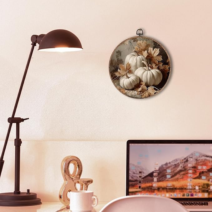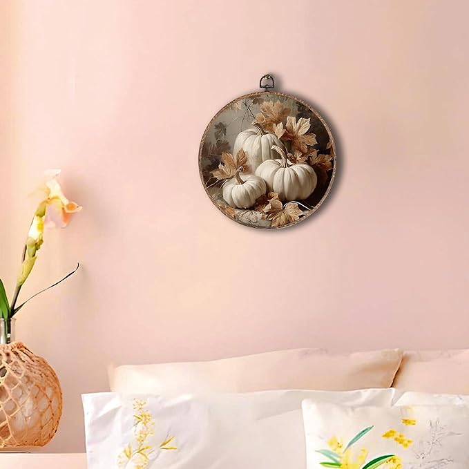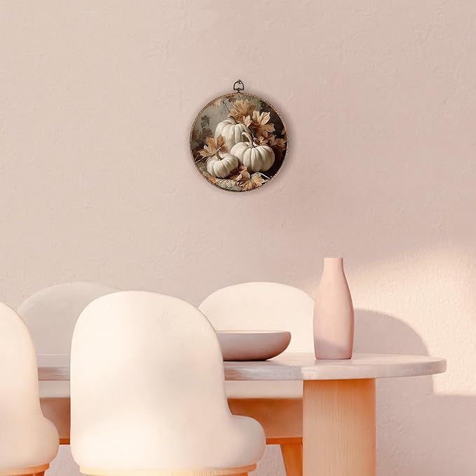 Hxlac Vintage Fall Pumpkin Maple Leaves Round Wall Art Framed, Fall Halloween Round Wall Decor, Vintage Autumn Hanging Canvas Prints Wall Sculptures for Farmhouse Home Living Room Decor, 10x10 Inch