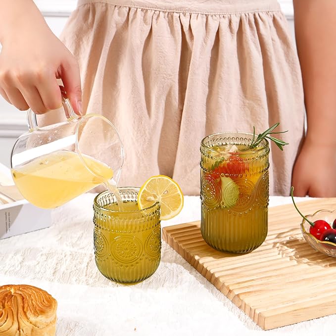 - [Elegant Floral Embossed Design]: A Touch of Vintage Charm. Each vintage drinking glasses features intricately embossed floral patterns, meticulously crafted with a special technique for a luxurious, textured finish. The vintage-inspired design adds sophistication to any table setting, turning ordinary meals into romantic dinners or festive gatherings. These cocktail glasses are perfect for enhancing your home décor, these glasses are not just functional but also aesthetic statement pieces.