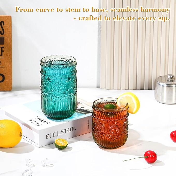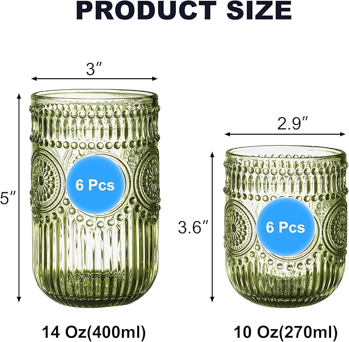 - [Versatile for All Beverages]: 2 Sizes for Every Occasion. This set includes two practical sizes to suit different drinks: 12oz vintage glassware: Ideal for beer, iced tea, juice, soda, milk or water—great for everyday use. 12oz water glasses: Perfect for cocktails, whiskey, espresso, or wines—adding elegance to your drink experience. Whether for casual family meals, parties, or bar use, these glasses meet all your serving needs!