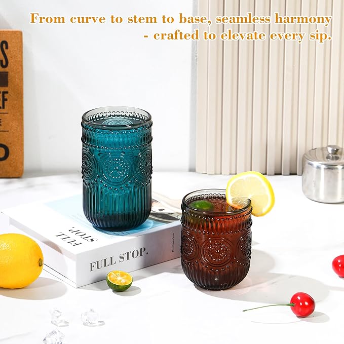 - [Versatile for All Beverages]: 2 Sizes for Every Occasion. This set includes two practical sizes to suit different drinks: 12oz vintage glassware: Ideal for beer, iced tea, juice, soda, milk or water—great for everyday use. 13oz water glasses: Perfect for cocktails, whiskey, espresso, or wines—adding elegance to your drink experience. Whether for casual family meals, parties, or bar use, these glasses meet all your serving needs!