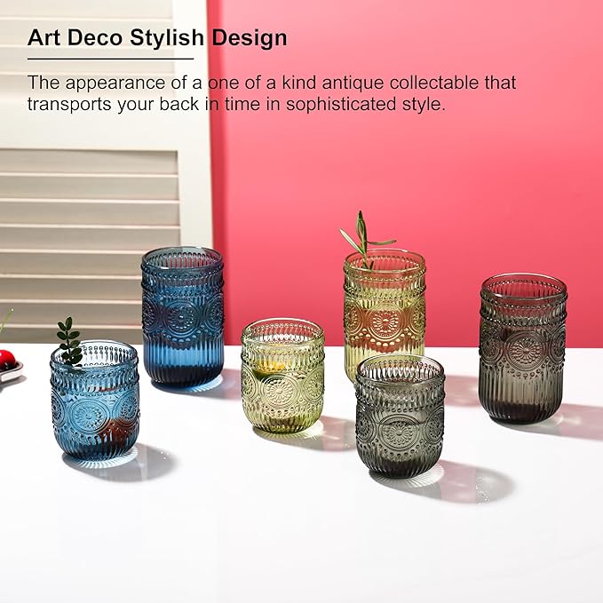 - [Elegant Floral Embossed Design]: A Touch of Vintage Charm. Each vintage drinking glasses features intricately embossed floral patterns, meticulously crafted with a special technique for a luxurious, textured finish. The vintage-inspired design adds sophistication to any table setting, turning ordinary meals into romantic dinners or festive gatherings. These cocktail glasses are perfect for enhancing your home décor, these glasses are not just functional but also aesthetic statement pieces.