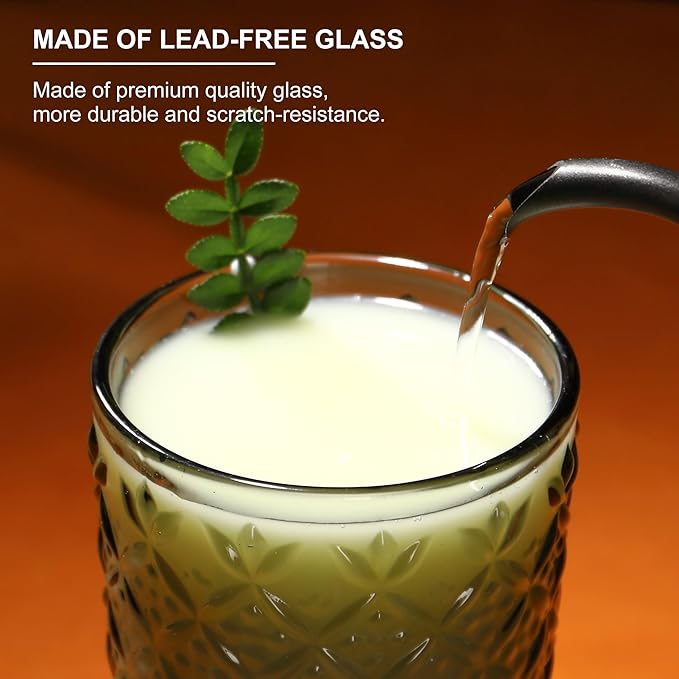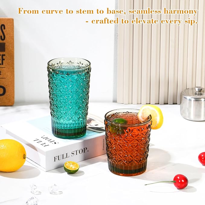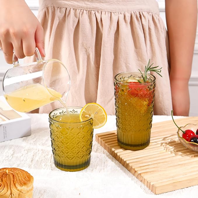 - [Versatile for All Beverages]: 2 Sizes for Every Occasion. This set includes two practical sizes to suit different drinks: 12oz vintage glassware: Ideal for beer, iced tea, juice, soda, milk or water—great for everyday use. 15oz water glasses: Perfect for cocktails, whiskey, espresso, or wines—adding elegance to your drink experience. Whether for casual family meals, parties, or bar use, these glasses meet all your serving needs!