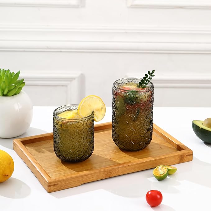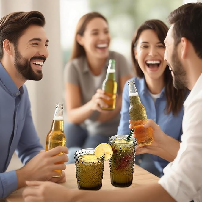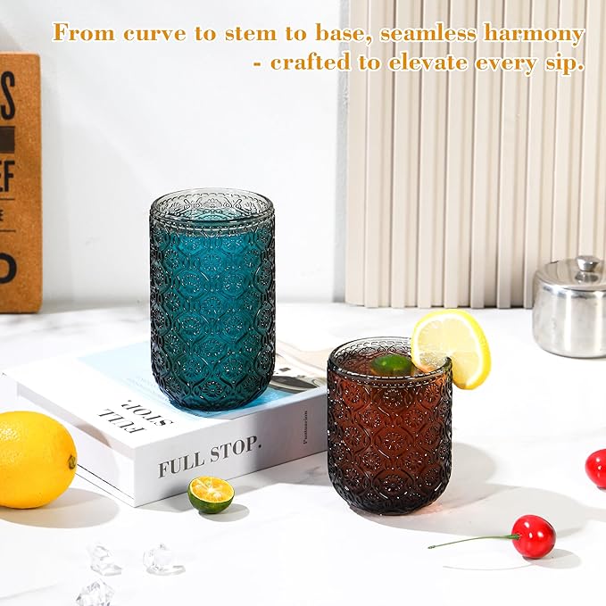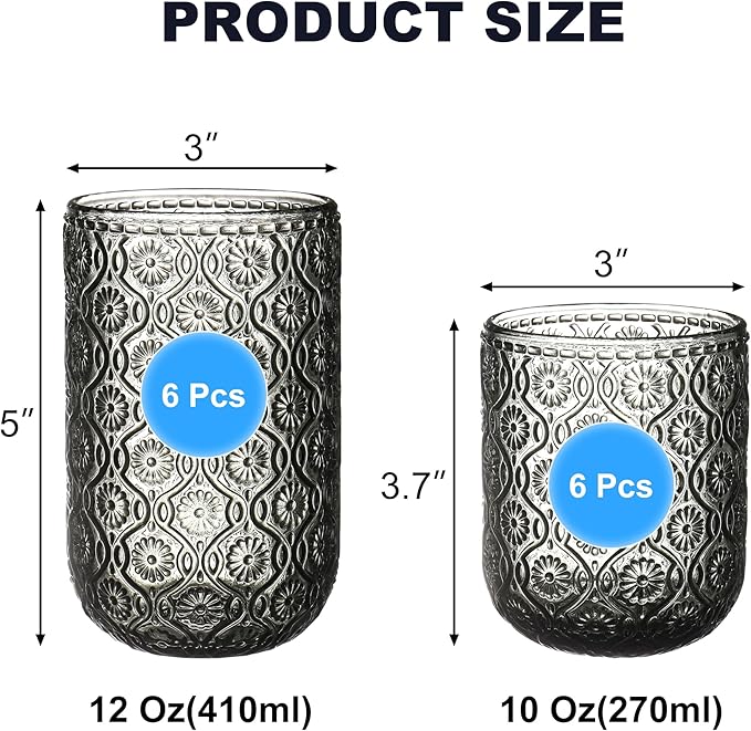 - [Versatile for All Beverages]: 2 Sizes for Every Occasion. This set includes two practical sizes to suit different drinks: 12oz vintage glassware: Ideal for beer, iced tea, juice, soda, milk or water—great for everyday use. 10oz water glasses: Perfect for cocktails, whiskey, espresso, or wines—adding elegance to your drink experience. Whether for casual family meals, parties, or bar use, these glasses meet all your serving needs!