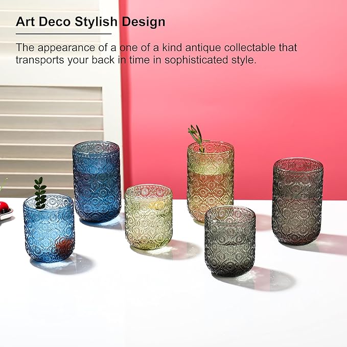 - [Dishwasher Safe & Fade-Resistant]: Unlike many glass cups that peel or fade in the dishwasher, our colored drinking glasses are designed with long-lasting, high-temperature-resistant finishes. Simply place these highball glasses in the dishwasher—no hand-washing required! The embossed patterns won’t wear off, saving you time and effort while keeping your glasses looking brand new.