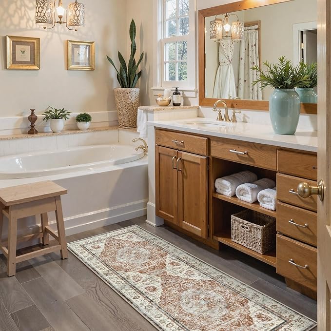 Uphome Bathroom Runner Rug, Distressed Tribal Farmhouse Orange Bathroom Mat, Large Bathroom Rugs Non Slip Washable, Oriental Retro Boho Bath Mat Runner for Bathtub Sink Hallway, 24x71 inch