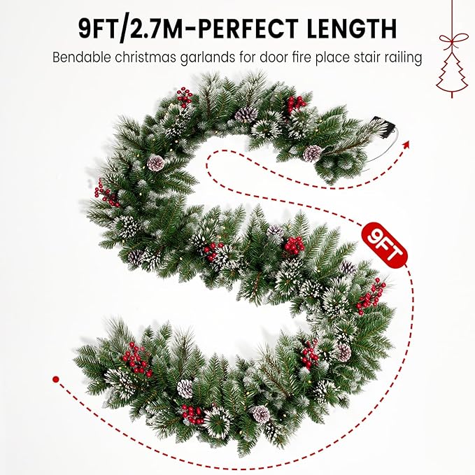 Guirnalda de Navidad de 9 pies con luz, Christmas conos de pino/bayas y luces LED multicolor preiluminadas (con control remoto), guirnalda de Navidad para chimenea, escaleras, puerta delantera