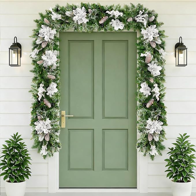 Guirnalda de Navidad preiluminada de 9 pies con exuberantes puntas de rama Christmas/flores plateadas/conos de pino y luces multicolores, guirnalda de Navidad para chimenea, escaleras, decoración de