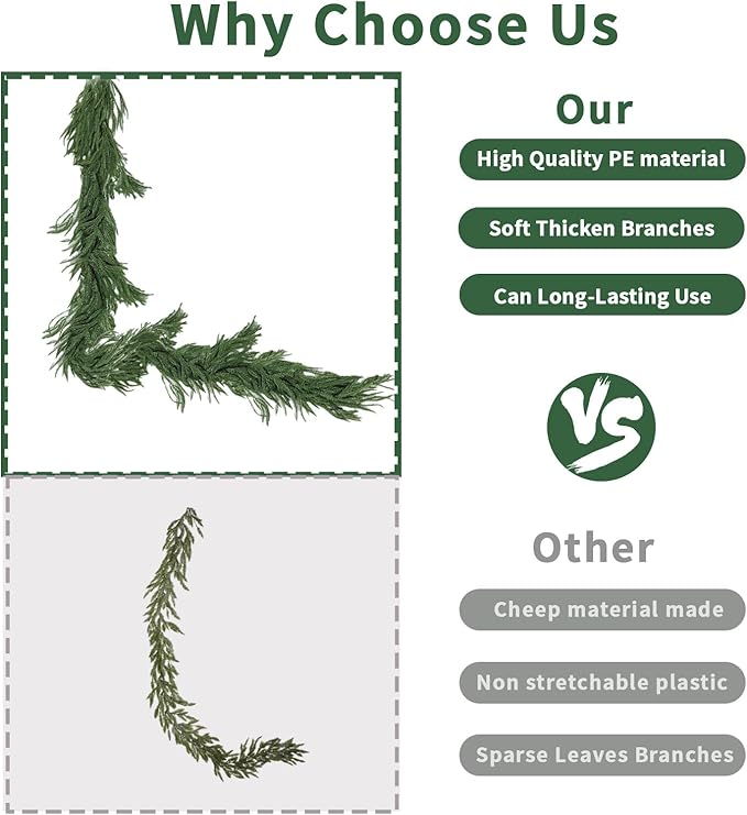 - Continue Reusing: Fake pine garland boasts a lifelike appearance; however, unlike real plants, it does not fade or rot, ensuring it always looks fresh and vibrant.xmas garland is both water-resistant and fade-resistant,after the season, you can easily store it in the provided packaging to reuse it next year