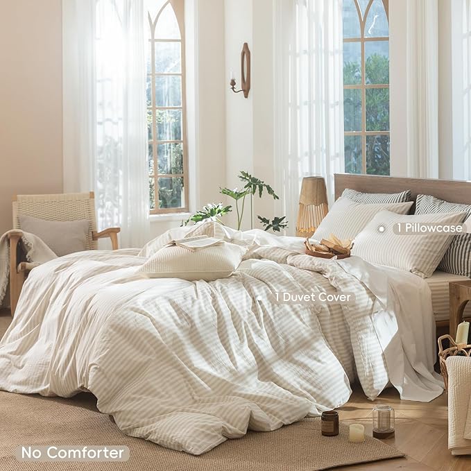 - Great Texture & Comfort: Looks like linen, feels like cotton, with a lived-in, slightly wrinkled look, which offers that feeling of staying at a nice resort where the duvet covet sets are always crisp, clean and comfortable. The relaxing look of this almond milk grey classic stripes bedding set and the cool texture make it hard to get out of bed.