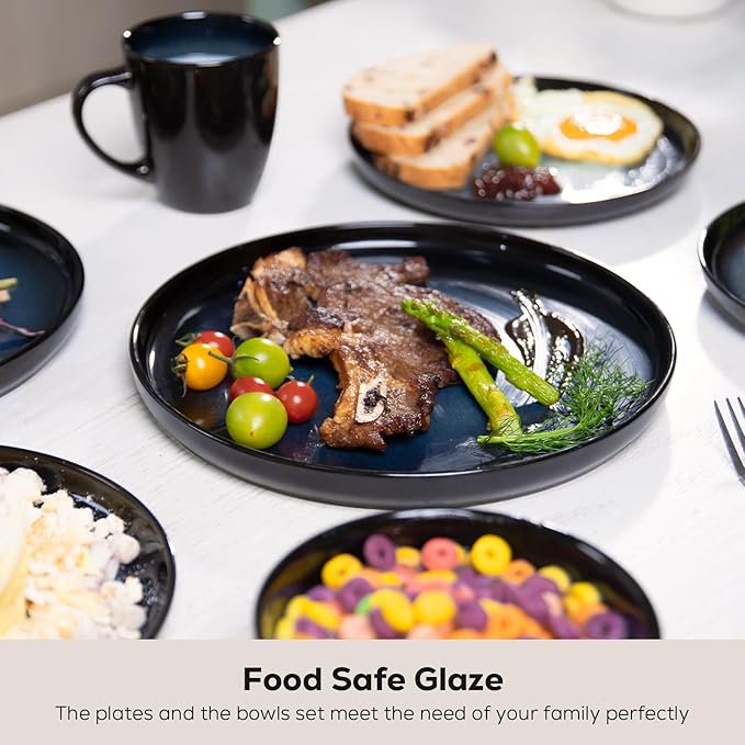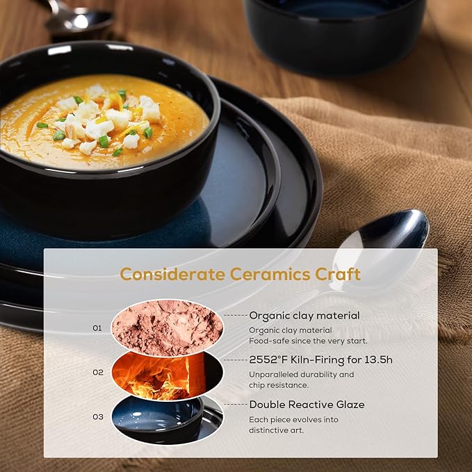 - Safe & Sustainable Dinnerware:Made from premium, organic natural clay, our stoneware is 100% lead-free and cadmium-free, guaranteeing safety for your family and the planet. Enjoy everything from hearty steaks to delicate desserts with absolute peace of mind.Fired at 2552°F for 13.5 hours, our dishes are extra-thick and heavyweight, resisting chips, scratches, and wear. They’re built to endure daily use