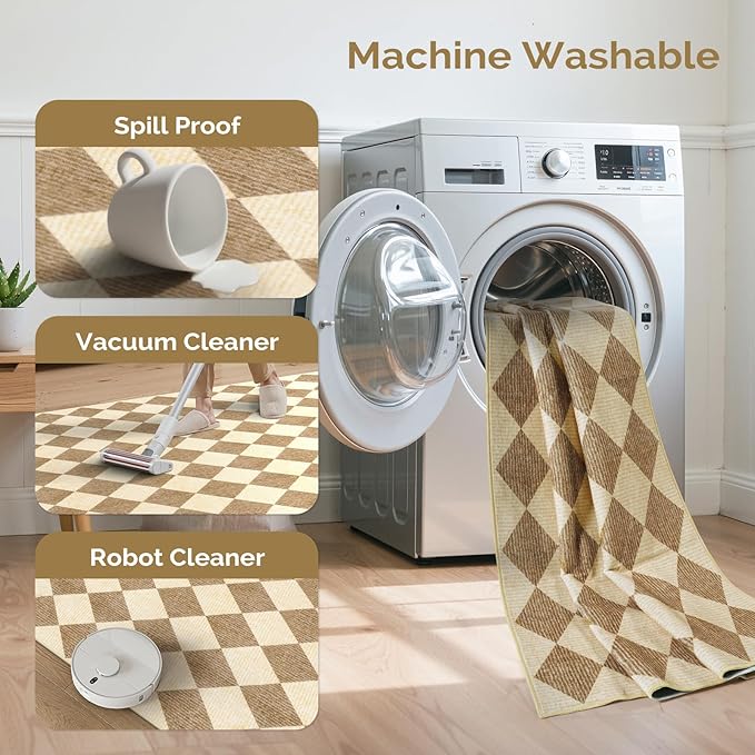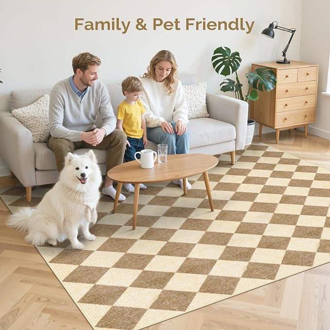 - 【Secure Non-Slip 】This brown checkered rug features a non-slip backing that firmly secures it in place, preventing movement on any floor. Its strong grip helps prevent slips and falls, so you no longer have to worry about unexpected messes from kids and pets. Additionally, it provides protection for your floors, guarding them against stains and scratches