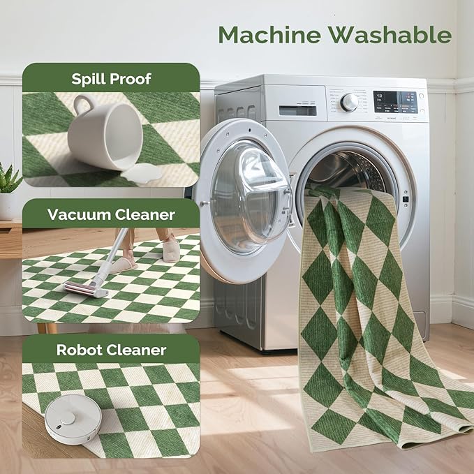 LIVEBOX 5x7 Checkered Rugs for Living Room, Washable Diamond Green Rug Non-Slip Modern Neutral Geometric Plaid Area Rugs for Bedroom, Low Pile Farmhouse Carpet for Office Kids Room Classroom Dorm
