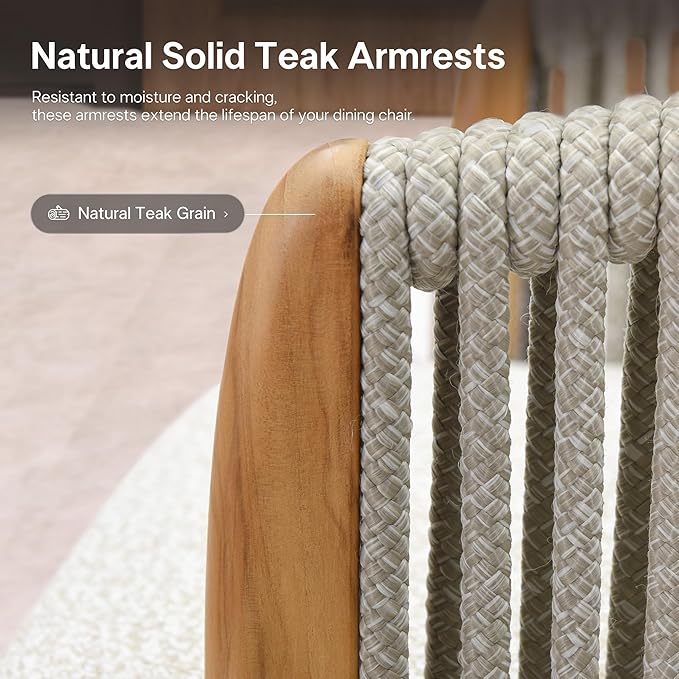 - Teak & Rope Accents: The outdoor dining chair features durable hand-woven 0.6" thickened rope backrests and smooth teak wood armrests that add natural elegance and strong support.