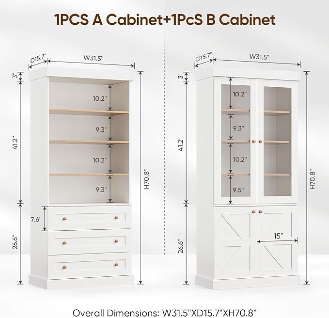 - 【Ample Storage with Adjustable Shelves】 Measuring 31.5"W x 15.7"D x 70"H, this bookcase offers adjustable shelves, a spacious bottom compartment, and your choice of glass doors or drawers. It’s perfect for storing books, decor, and everyday essentials, blending functionality with elegance.