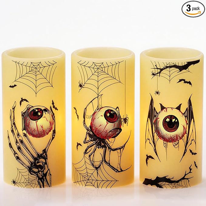 Eldnacele Halloween Flameless Flickering Candles with Timer, Battery Operated Spider Eyeballs, Bat Eyeballs, Skeleton Hand Eyeballs Decals Real Wax LED Pillar Candles Horror Spooky Decor(3pcs,D3×H6)