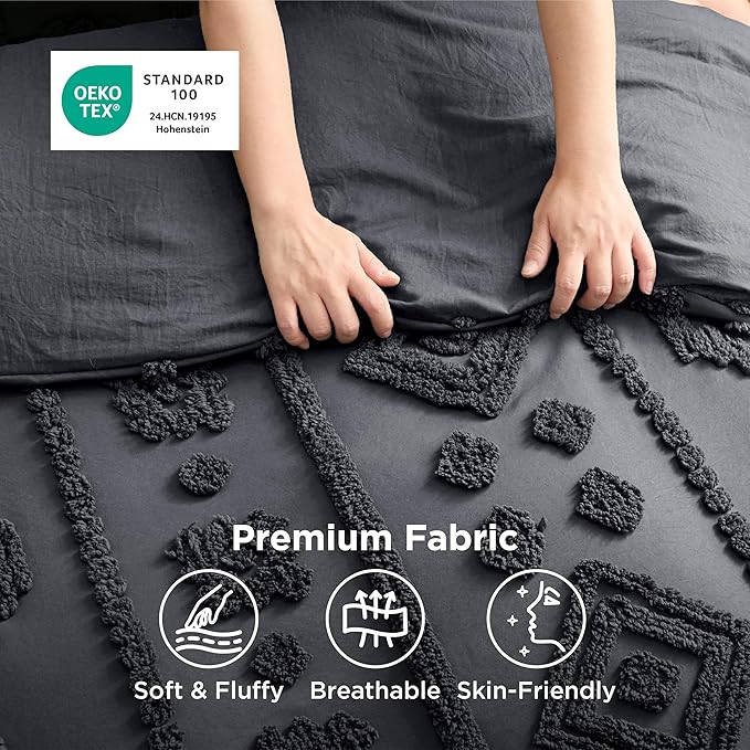Bedsure Queen Size Comforter Set - Dark Grey Tufted Boho Bed Set, Farmhouse Shabby Chic Embroidery Bedding for All Seasons, 3 Pieces, 1 Soft Jacquard Queen Comforter and 2 Pillow Shams