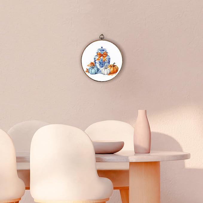 Hxlac Chinoiserie Pumpkin Fall Round Wall Art Framed, Blue and White Porcelain Pumpkin Round Wall Decor, Coquette Bow Chinoiserie Hanging Canvas Prints Wall Sculptures for Home Room Decor, 10x10 Inch