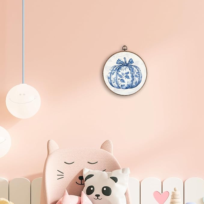 Hxlac Chinoiserie Pumpkin Fall Round Wall Art Framed, Blue and White Porcelain Pumpkin Round Wall Decor, Autumn Halloween Hanging Canvas Prints Wall Sculptures for Home Room Decor, 10x10 Inch