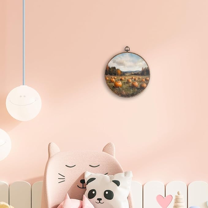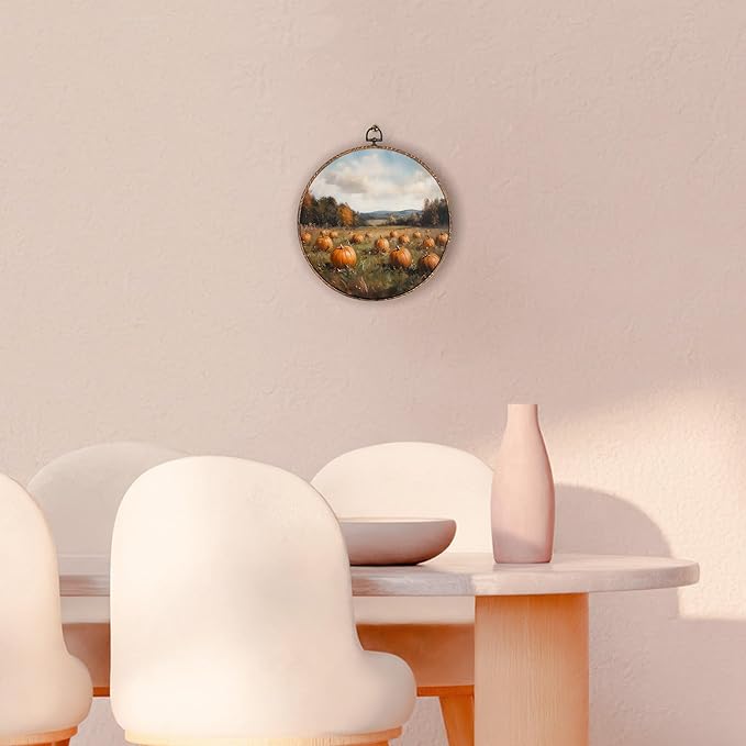 Hxlac Vintage Pumpkin Field Pumpkin Round Wall Art Framed, Vintage Autumn Pumpkin Round Wall Decor, Cottage Fall Halloween Hanging Canvas Prints Wall Sculptures for Home Room Decor, 10x10 Inch