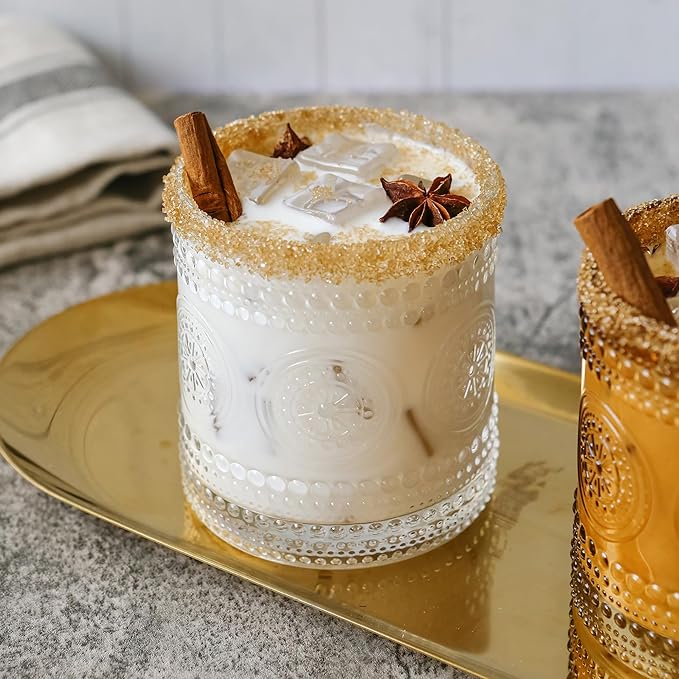 - Vintage-inspired design and embossing that are long lost to bring you a glass that you will be proud to serve your guest with! They will elevate every cocktail or signature mocktail. They look great on a bar cart or with exposed cupboards. Great for floating shelves or behind your favorite bar.