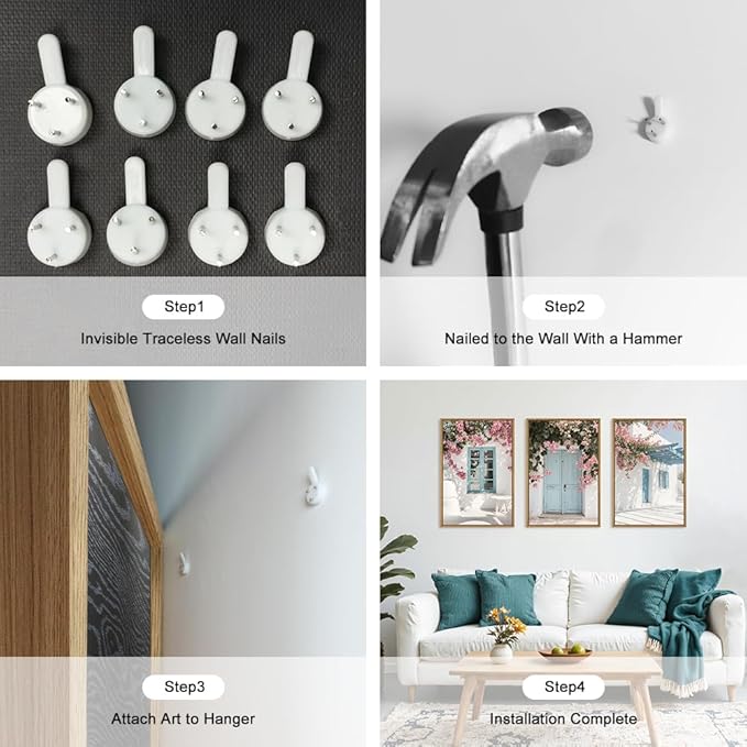 - 【Modern Greek Island Blue White Wall Art】The decorative paintings in this set feature a modern yet vintage design with a focus on nature's beauty. They skillfully incorporate elements of bougainvillea, shutters, and doors, using blue and white hues as the primary colors to create a fresh, inviting, and retro aesthetic that complements any living space.