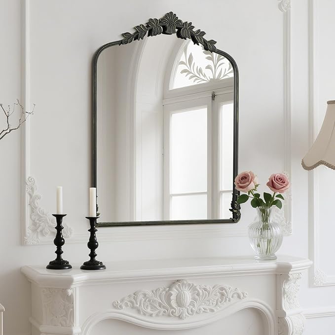 - EXQUISITE DESIGN:This black vintage mirror features a complex and unique floral pattern in an arched shape.Its meticulously designed frame adds a classic and timeless charm to your home decor,making it the focal point of any room.