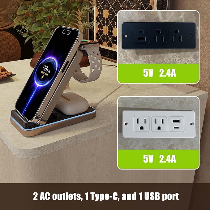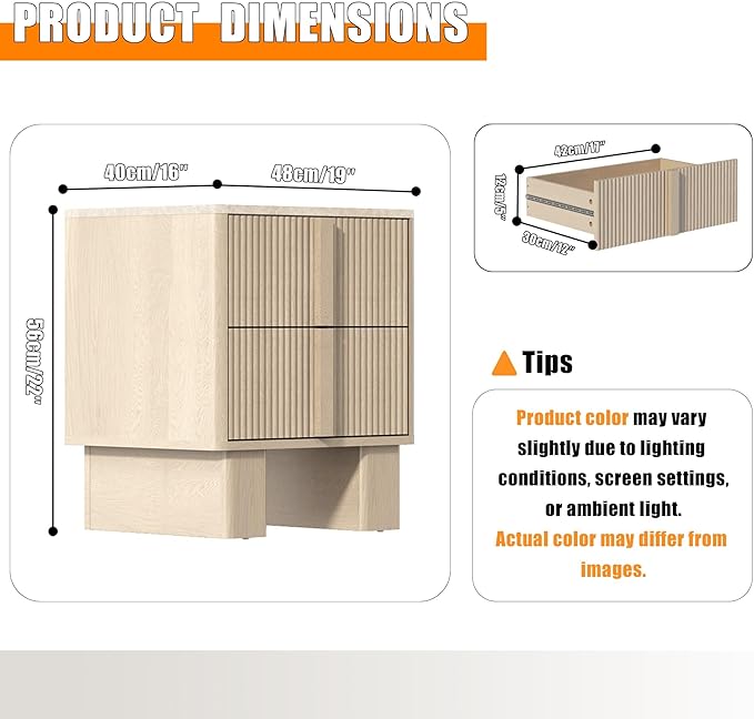 - Spacious & Functional Nightstand with Charging Station. Modern nightstand (19"D x 16"W x 22"H) features a built-in charging hub with 2 AC outlets, 1 Type-C, and 1 USB port. Two extra-wide drawers (17"D x 12"W x 5"H) provide ample space for books, glasses, electronics, and personal items—perfect for keeping your bedside essentials organized