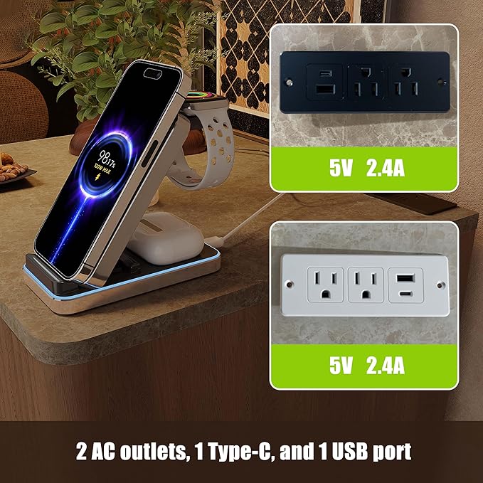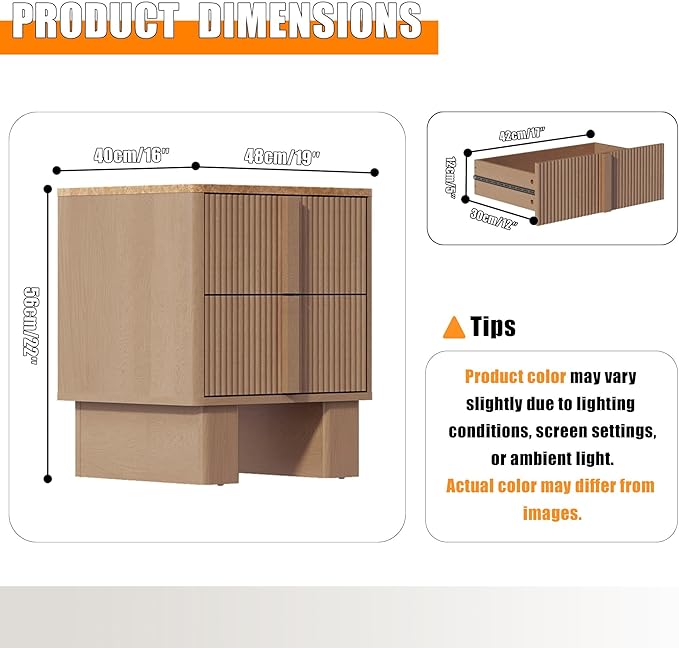 - Spacious & Functional Nightstand with Charging Station. Modern nightstand (19"D x 16"W x 22"H) features a built-in charging hub with 2 AC outlets, 1 Type-C, and 1 USB port. Two extra-wide drawers (17"D x 12"W x 5"H) provide ample space for books, glasses, electronics, and personal items—perfect for keeping your bedside essentials organized