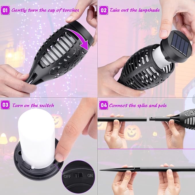 - Cute Torches & Warm Tips: The size of halloween torch lights are 2.9*20.5 inch with pole and spike, lovely and cute for Halloween outdoor decorations. Since it is powered by solar energy, the actual working time is affected by the installation location and the weather conditions. Firstly receiving package, please turn on the switch and put under direct sunlight.