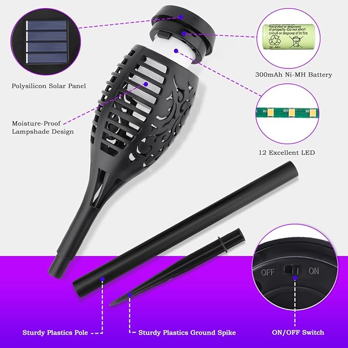 - Package List & Warm Tips: The package list includes 10* solar torch lights, 10* ABS ground stakes, 10* ABS ground spikes, 1* instruction manual and 1* packing box. Warm Tips: Cloudy, Rainy and Winter Day will shorten the night lighting time of solar yard lights, even not working.