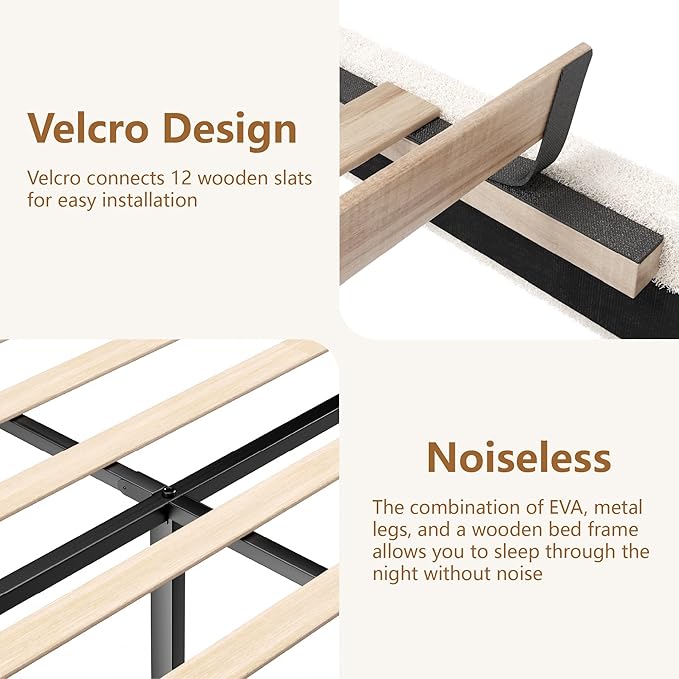 - Sturdy & Noise-Free Design: Built to last with sturdy legs, a support metal frame, and solid wood slats, this bed frame offers exceptional strength and long-lasting durability. Velcro slats eliminate squeaking noises. Built to support up to 1000 lbs without compromising on comfort or stability.