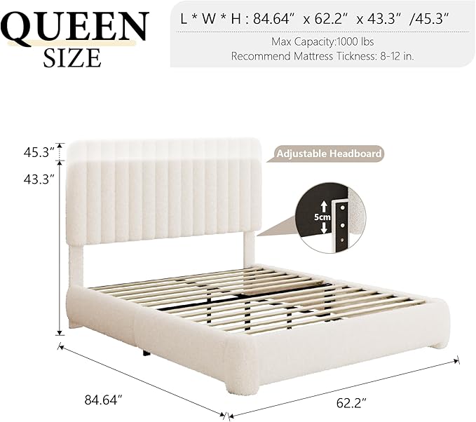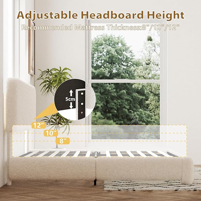 - Adjustable Headboard: Beige boucle upholstered bed frame features a plush, soft headboard with 3 adjustable height settings designed to fit mattresses 8", 10", and 12" thick. Easily customize your bed height for optimal comfort and style.