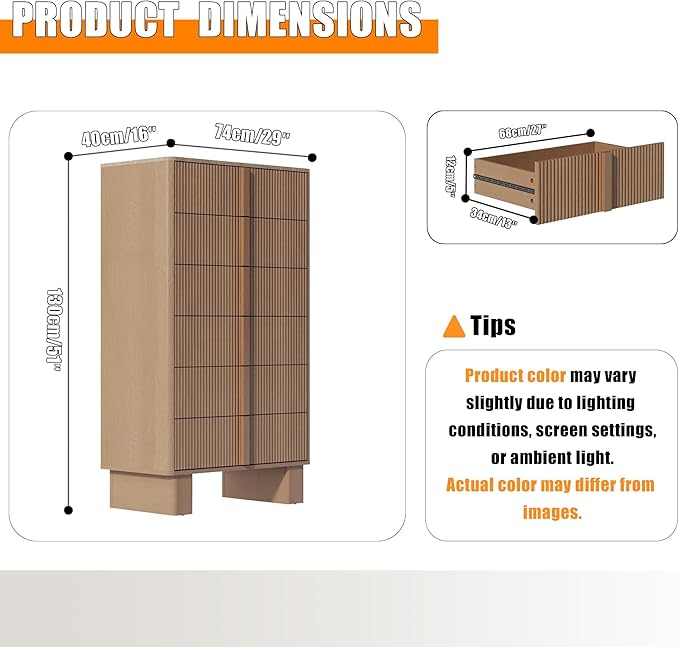 - Spacious 6-Drawer Storage<br> Functioning as both a tall dresser and chest of drawers, 6 drawer dresser for bedroom offers ample space for clothing, bedding, and accessories