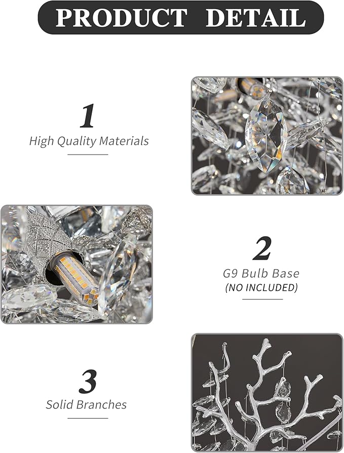 - Modern Tree Branch Crystal Chandelier: The surface of the chandelier is completed by metal painting process, corrosion resistance, rust prevention, and easy installation. The chrome stems are thickened and encrypted, and the branches can be adjusted manually. Sparkling crystals are strung across the branches of this light fixture. Crystal Tree branch chandelier lighting is perfect for luxury and it helps to create a luxurious and vibrant atmosphere in the room